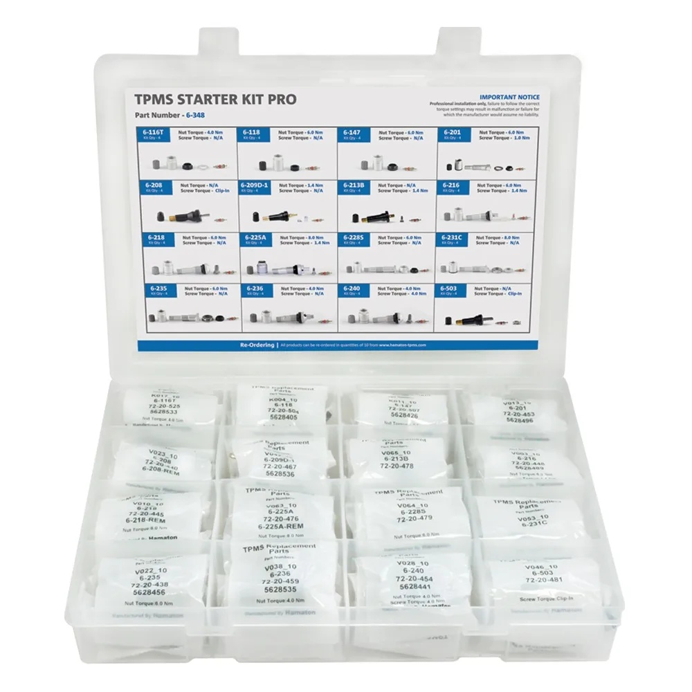 Hamaton Starter Kit Pro biedt een selectie van de meest populaire onderdelen voor sensorvervanging, die 99% van de Europese directe TPMS-compatibele v...