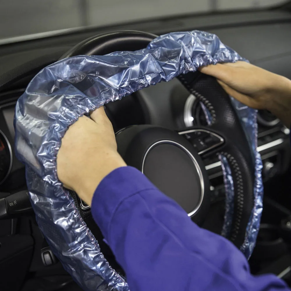 Horn & Bauer Stuurhoesfolie met handvat, ter bescherming van het stuurwiel tijdens werkzaamheden in de werkplaats. Voor ongeveer 215 sturen te gebruik...