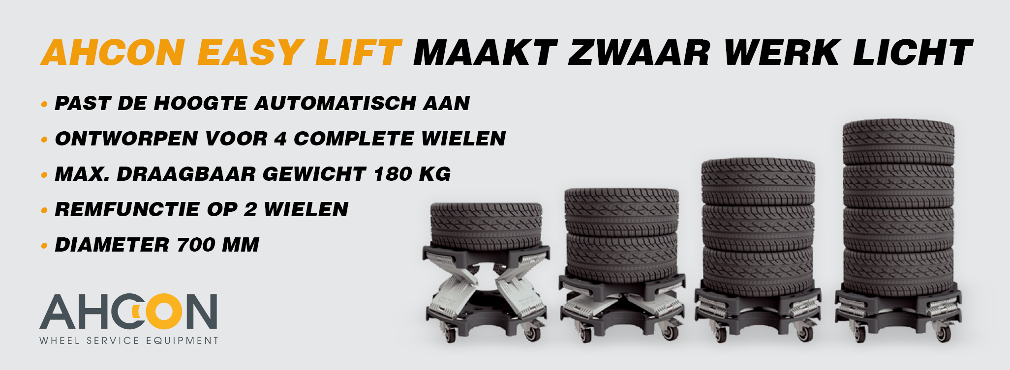 Ahcon introduceerde onlangs een nieuwe ergonomische wieltrolley met de naam “Easy Lift”. Het is een trolley die zichzelf in hoogte aanpast, al naar gelang de belasting, zodat u niet hoeft te bukken bij het wegleggen of oppakken van banden en wielen.