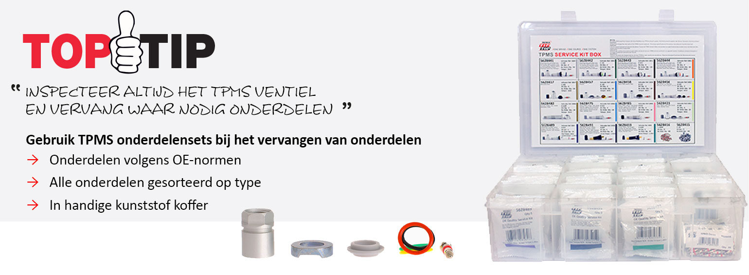 Elke keer dat een band met een direct TPMS-systeem vervangen wordt, is het raadzaam om een geschikte TPMS onderdelenset te gebruiken ter vervanging van de slijtdelen (moer, O-ring, vernikkeld binnenventiel, ventieldop). Dit zorgt voor een hogere veiligheid, het voorkomt luchtlekkage en grotere gevolgschade.
