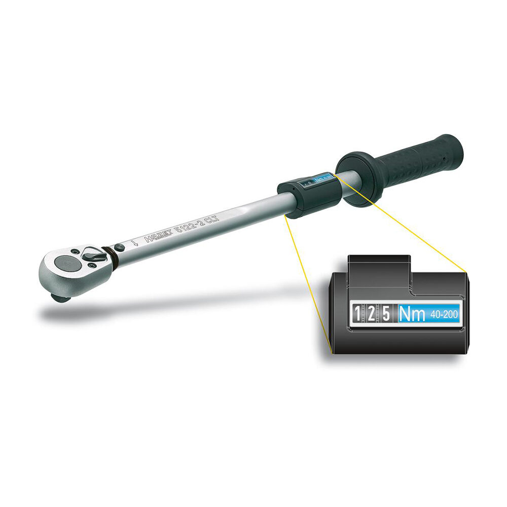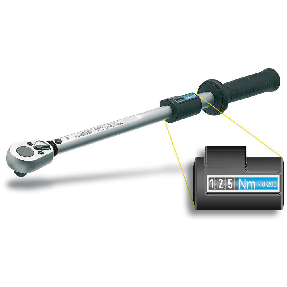 Hazet Momentsleutel met omschakelratel en een 1/2" aandrijfgrootte. Nauwkeurigheid bij aanhalen ca. 4% van de schaalwaarde, met draaiknop voor extra vergrendeling van de instelling.