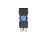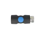 Door op de blauwe knop te drukken sluit de snelkoppeling de luchttoevoer af, de slang wordt ontlucht en vastgehouden in de snelkoppeling tot hij drukloos is.