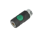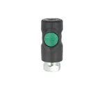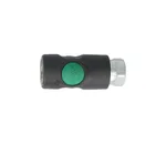 Door op de groene knop te drukken sluit de snelkoppeling de luchttoevoer af, de slang wordt ontlucht en vastgehouden in de snelkoppeling tot hij drukloos is.