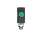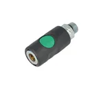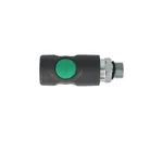 Door op de groene knop te drukken sluit de snelkoppeling de luchttoevoer af, de slang wordt ontlucht en vastgehouden in de snelkoppeling tot hij drukloos is.