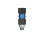 Door op de blauwe knop te drukken sluit de snelkoppeling de luchttoevoer af, de slang wordt ontlucht en vastgehouden in de snelkoppeling tot hij drukloos is.