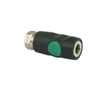 Door op de groene knop te drukken sluit de snelkoppeling de luchttoevoer af, de slang wordt ontlucht en vastgehouden in de snelkoppeling tot hij drukloos is.
