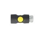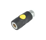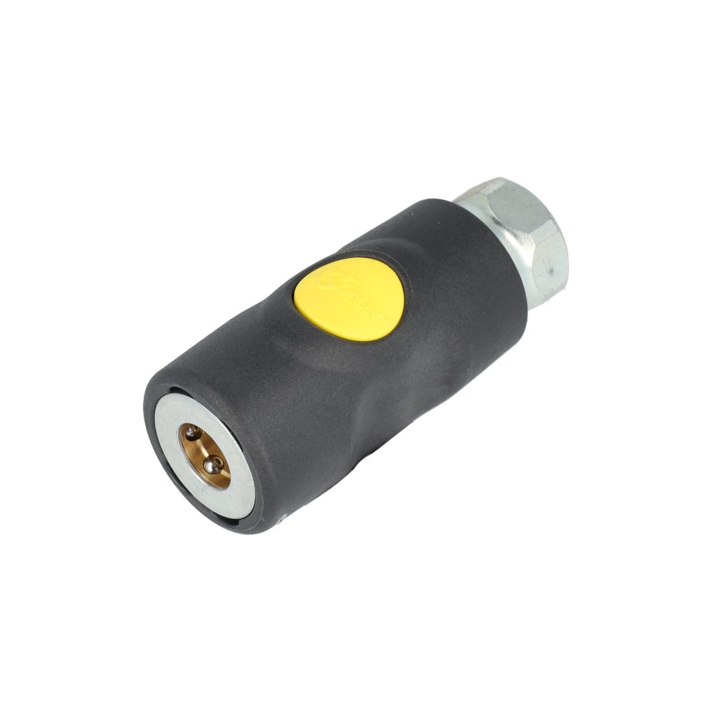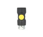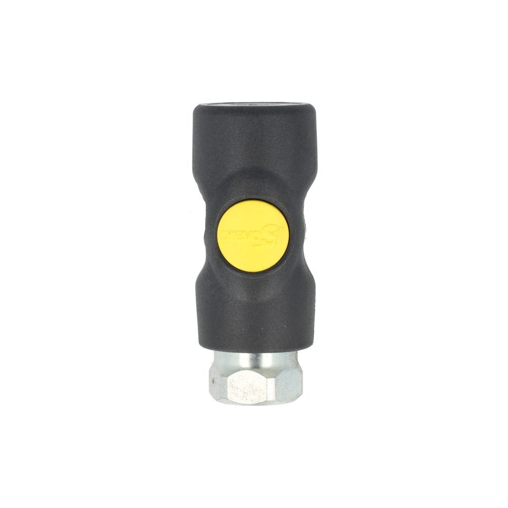 Door op de gele knop te drukken sluit de snelkoppeling de luchttoevoer af, de slang wordt ontlucht en vastgehouden in de snelkoppeling tot hij drukloos is.