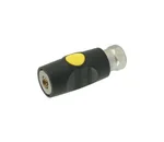 Prevost veiligheids koppeling met gele drukknop ontlucht en ontkoppeld door enkele druk op de knop en is een stalen koppeling met krasarme kunststof omhulling.